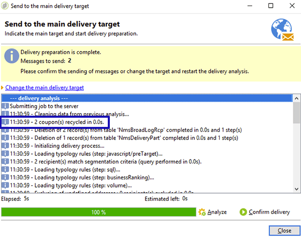 「分析」をクリックします。分析ログですべての受信者に対して十分なクーポンがあることを確認したら、「配信を確定」をクリックして送信します。