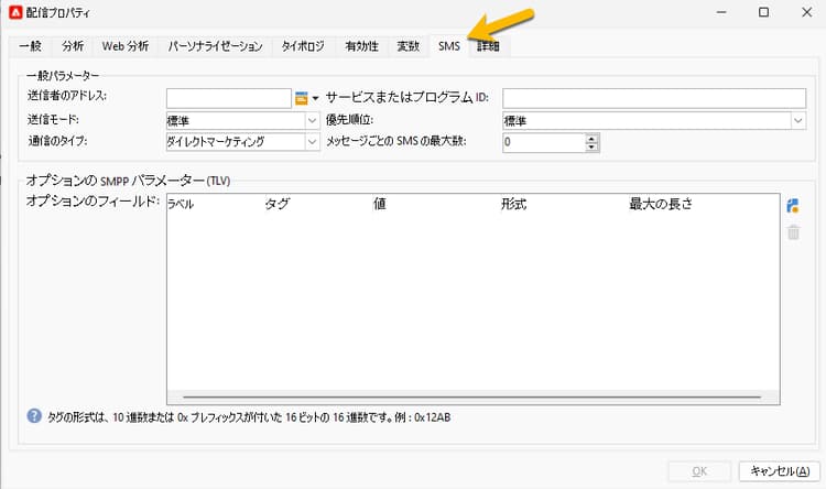 - タグ:10 進数形式(例:12345)または 0x 接頭辞が付いた 16 進数形式(例:0x12ab)のいずれかのタグの値。タグには 0~65535 の範囲を指定できます。サポートされているタグについて詳しくは、SMPP サービスプロバイダーにお問い合わせください。