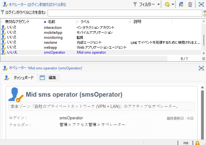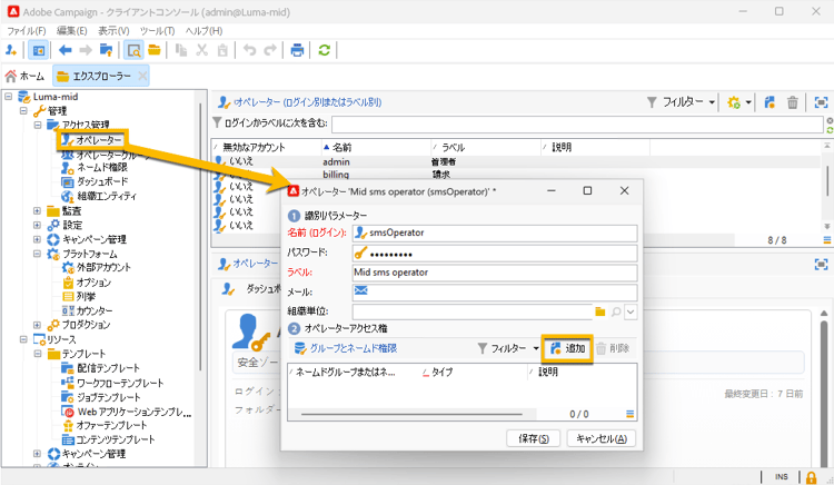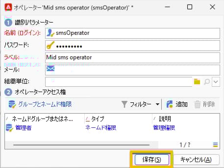 管理/アクセス管理/オペレーター で、「新規」をクリックし、開いた新しいウィンドウのフォームに入力します。