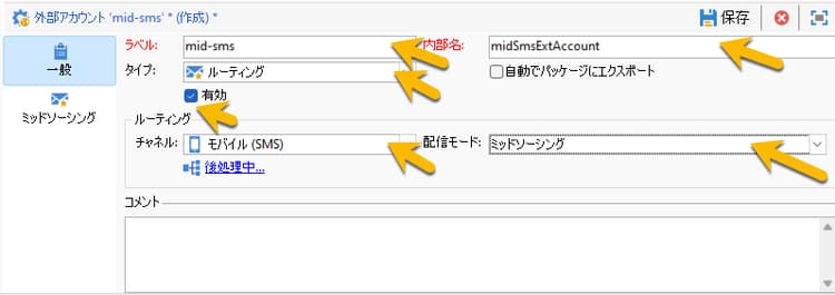 外部アカウントの ラベル と 内部名 を設定します。アカウントタイプを ルーティング として定義し、「有効」ボックスをオンにして、チャネルに「モバイル(SMS)」、配信モードに「ミッドソーシング」を選択します。