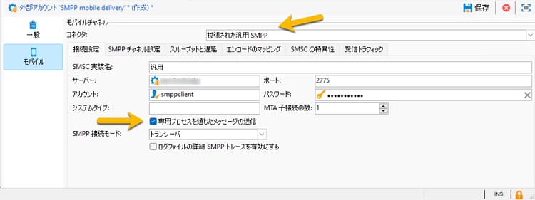 「モバイル」タブで、コネクタ ドロップダウンリストにある 拡張された汎用 SMPP をそのままにしておきます。