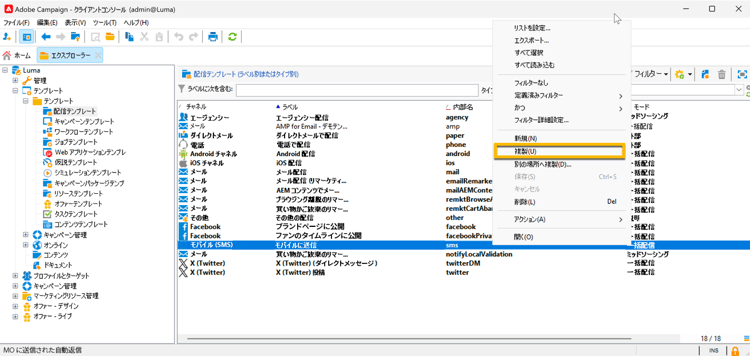 マーケティングサーバーの リソース/テンプレート/配信テンプレート で、既存のモバイル配信テンプレートを右クリックし、「複製」を選択します。