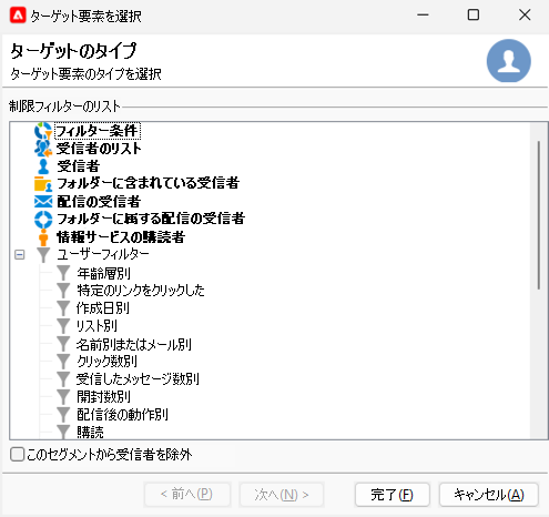 「このセグメントから受信者を除外」オプションを使用すると、定義したターゲット基準を満たさない受信者をターゲットにすることができます。これを使用するには、適切なボックスを選択し、事前に定義した、該当するプロファイルを除外するためのターゲティングを適用します。