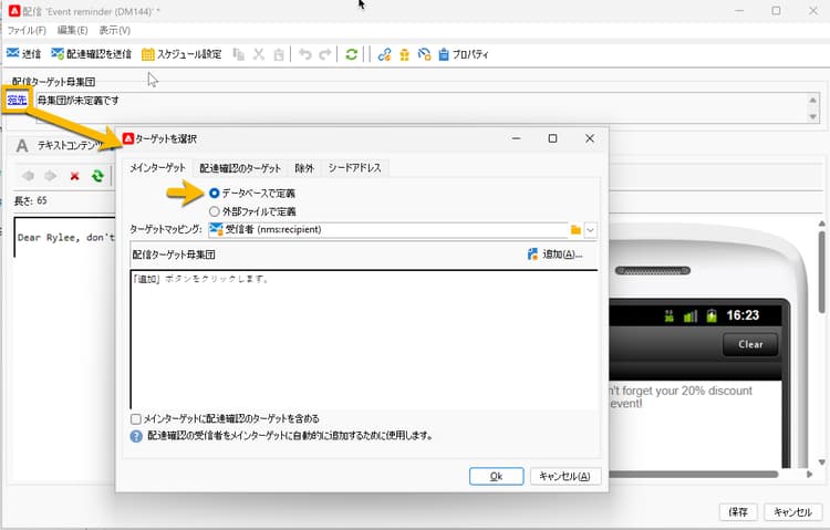 オーディエンスは Adobe Campaign データベースに保存されるので、「メインターゲット」タブで「データベースで定義」オプションを選択します。