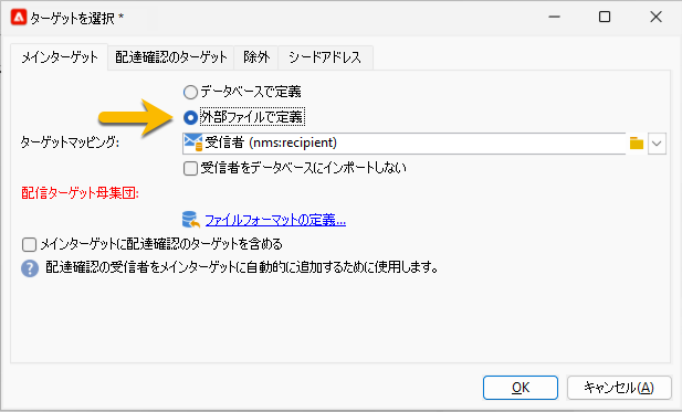 デフォルトでは、受信者はデータベースにインポートされます。この場合は、「ターゲットマッピング」を選択する必要があります。ターゲットマッピングについて詳しくは、ターゲットマッピングの操作を参照してください。