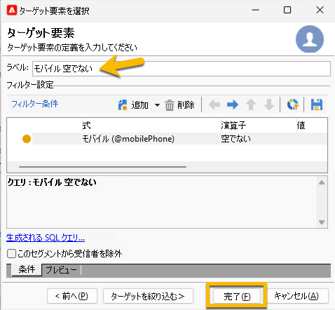 ラベルフィールドにオーディエンスの名前を入力し、「終了」ボタンをクリックしてオーディエンスを検証します。