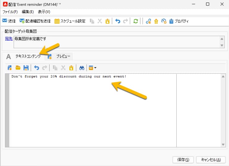 「テキストコンテンツ」タブにメッセージのコンテンツを入力します。