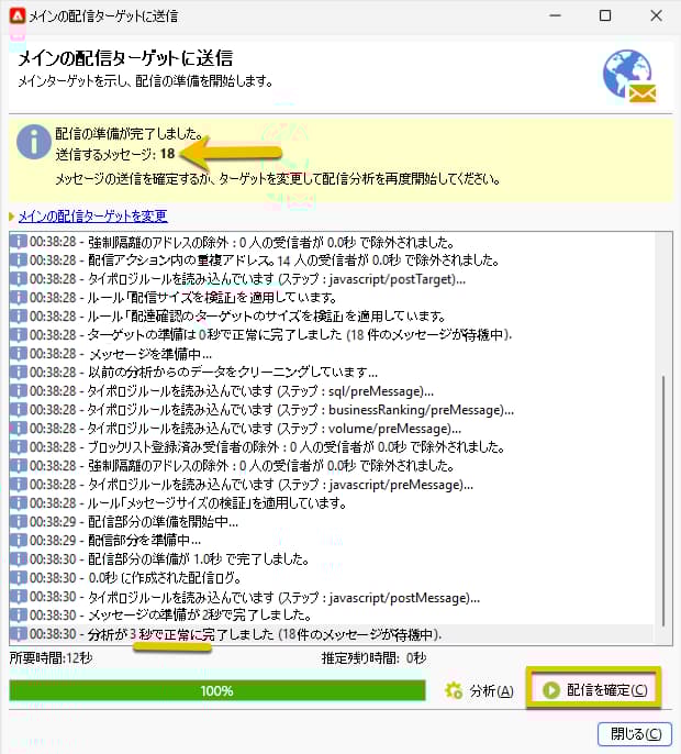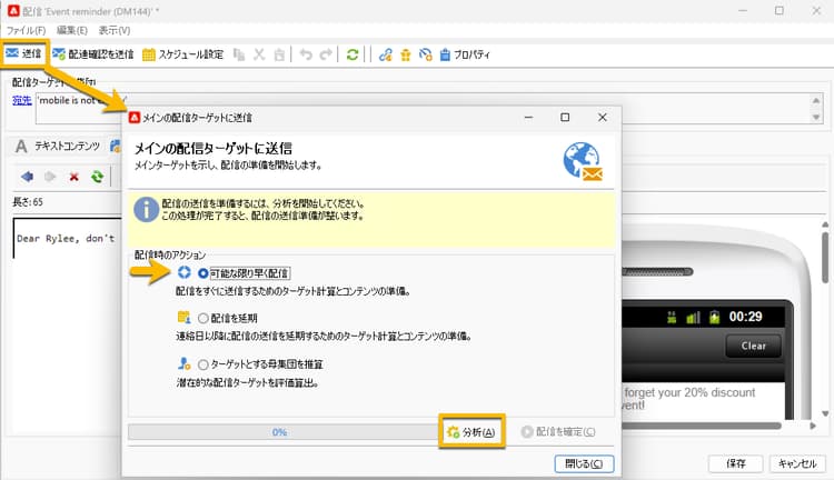 開いたウィンドウで、自分に合った適切なアクションを選択します。以下の例では、「可能な限り早く配信」を選択すると、「分析」ボタンが表示されます。その「分析」ボタンをクリックします。