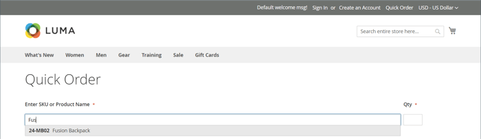 クイックオーダー 機能を使用すると、注文する製品の製品名または SKU がわかっているお客様は、注文プロセスを数回クリックするだけで済みます。 複数の SKU を持つ注文は、手動で入力することも、クイックオーダーフォームにインポートすることもできます。 クイックオーダーは、アカウントにログインしている顧客と、ゲストが使用できます。 有効化すると、ページ上部の顧客名の横に「クイックオーダー」リンクが表示されます。