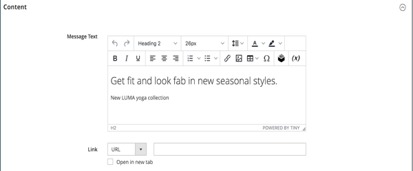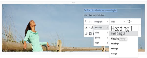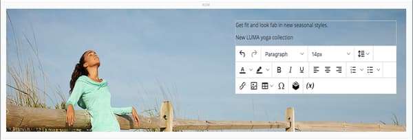 Get fit and look fab in new seasonal styles.New LUMA yoga collectionテキストボックスの上にエディターツールバーが表示されます。 テキストの入力と書式設定は、ステージから直接行うことも、バナーツールボックスの 設定 を選択して行うこともできます。