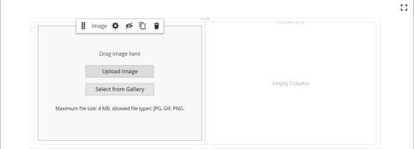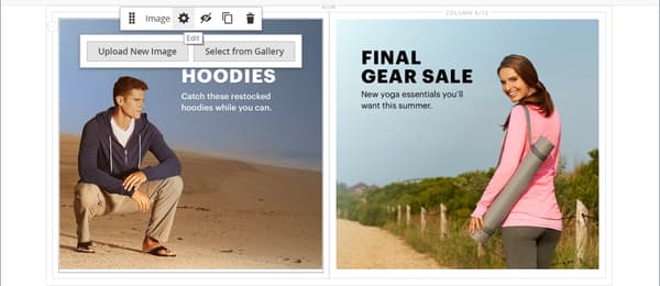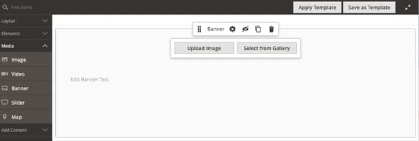 note note NOTE ステージに 2 つのコンテンツコンテナが追加され、それぞれに個別のツールボックスが表示されます。 バナーは行内にネストされているので、正しいツールボックスで作業していることを確認してください。 ツールボックスに加えて、画像をアップロード ボタンと ギャラリーから選択 ボタンが含まれており、ステージから直接バナーに素早く変更を加えることができます。