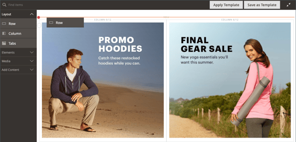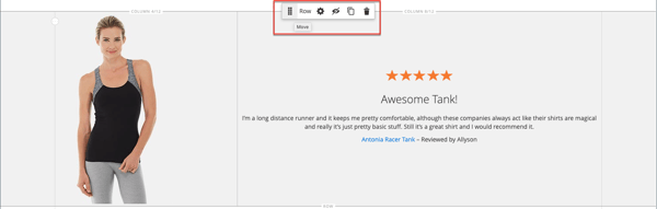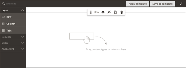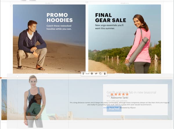 Layoutの下の Page Builder パネルで、Rowプレースホルダーをステージにドラッグし、この演習の 2 番目の部分で作成した行の上に配置します。
