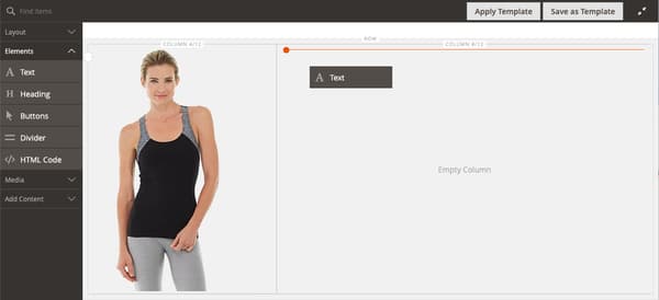 Page Builder パネルで、「Elements」セクションを展開し、Text コンテンツタイプを 2 番目の列にドラッグします。
