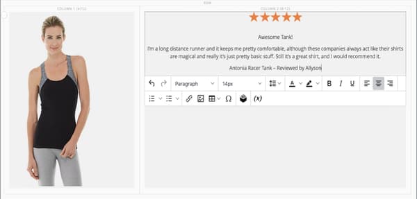 このページの最後の行には、製品レビューのコンテンツが表示されます。 全幅の行を追加し、幅の異なる 2 つの列に分割します。 最初の列に背景画像が追加され、一致する背景色が行に適用されて、統一された効果が得られます。