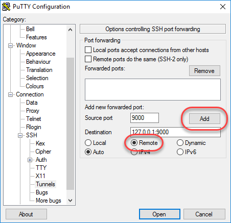 Putty を使用して Windows に SSH トンネルをセットアップするには: