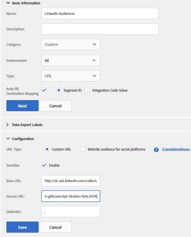 AAMで、LinkedIn オーディエンスと呼ばれる新しい URL の宛先を次の設定で作成します 以下の添付スクリーンショットを参照)。