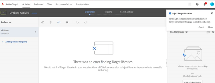 オーサリングを有効にするために、拡張機能でページにターゲットライブラリを追加することを許可するよう求めるポップアップ。これを許可する必要があります。