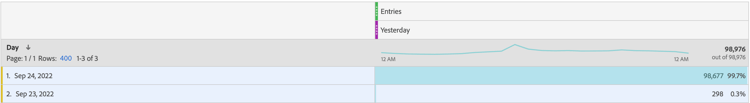 この例では、レポートウィンドウ が 9 月 24 日(昨日)の場合、この訪問はレポートに含まれます。 ただし、エントリ 指標の属性は 9 月 23 日なので、日 ディメンションの 2022 年 9 月 23 日 もレポートに表示されます。
