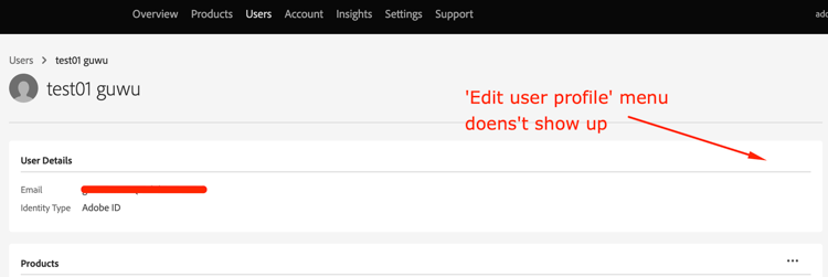 ユーザー ID (Federated ID、Enterprise IDまたはAdobe ID)にはシステム管理者権限がありますが、Admin Consoleのユーザー ID の ユーザープロファイルを編集 メニューは表示されません。 ユーザー ID 名(例:次の画像の test01 guwu)を更新するにはどうすればよいですか?