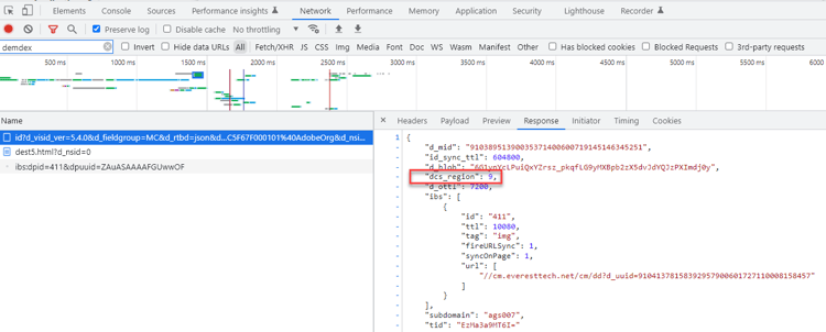 エンドユーザーに最も近いリージョンノードが決定されると、そのリージョン ID は、今後の Analytics、Target およびAEP WebSDK 呼び出しを介して渡されます。 Analytics では、Analytics のクエリ文字列パラメーターとして渡されます。