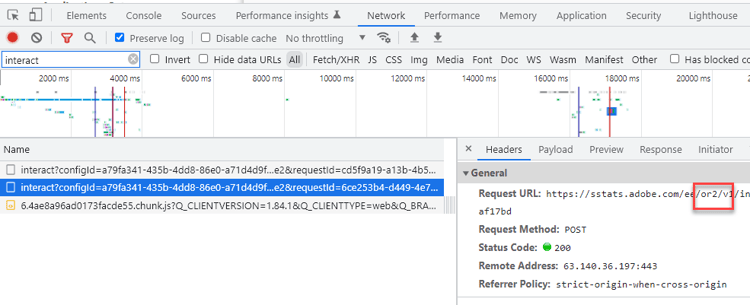 注意: 地域がまだ決定されていないので、AEP WebSDK からの最初のインタラクト呼び出しではパス内の地域は取得されませんが、場所のヒントが応答に含まれます(上記のとおり)。 元のリクエストのパスは ..../ee/v1/.... のみになりますが、後続の呼び出しには、/ee/ and /v1/ のパス要素間の地域ノード情報が含まれます。