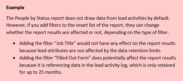 ただし、レポートのスマートリストに追加されたフィルターがある場合、デフォルトでリードアクティビティを参照しないレポートも影響を受ける可能性があります。 リード属性(リードレコード内のフィールドの情報)を参照するフィルターを使用しても、レポートは変更されません。 リードが実行したアクティビティを検索するフィルターは、最大 25 か月間アクティビティにのみアクセスできるので、アクティビティが先に実行された場合は、レポートの結果が変更されます。