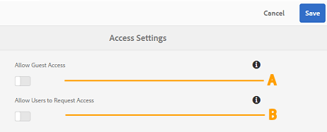 Adobe Experience Manager Assets Brand Portal 6.4.2 以降では、管理者は、ゲストによるアクセスを設定し、ユーザーが自分の組織のBrand Portalでアクセスをリクエストできるようにすることが許可されています。 これらの設定は、管理パネルで アクセス設定 として提供されています。これらの設定は両方とも、デフォルトでは無効になっています。