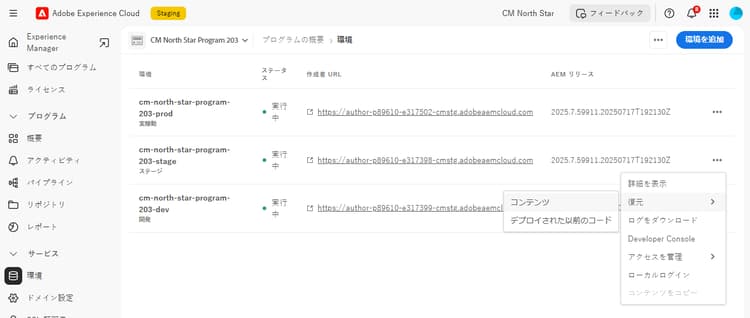 4. 「環境」テーブルで、コンテンツを復元したい環境の右側にある 詳細アイコンまたは省略記号メニューアイコン をクリックし、次に​ 「コンテンツを復元」 ​をクリックします。