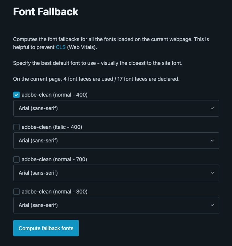 ページで拡張機能を開くと、そのページで使用されているフォントの書体が分析されます。フォントの書体は、フォントファミリーとフォントの太さを組み合わせたものです。 これで、これらのフォントの各面に対して、デフォルトのブラウザーフォントを選択し、フォントのフォールバック計算を実行できます。 拡張機能は、各フォント size-adjustment について、コンテンツの幅が両方のフォントで同じになるように、デフォルトのブラウザーフォントのうちどのフォントが必要かを計算します。