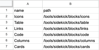 6.次に、columns ブロックに行を追加する必要があります。 最初の列のブロック名と、2 番目の列のブロックのバリエーションを定義するドキュメントの URL を追加します。 例えば、columns ブロックを追加する場合は、名前が Columns でパスが /tools/sidekick/blocks/columns の行を作成できます。 ライブラリを複数の環境(ページ、ライブ、実稼動)で機能させるには、パス列に絶対 url を使用しないでください。