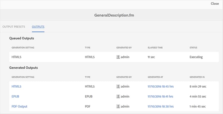 FrameMaker ドキュメントの出力生成タスクを開始すると、AEM Guidesはこのタスクを出力生成キューに送信します。 このキューはリアルタイムで更新され、キュー内の各出力生成タスクのステータスを示します。