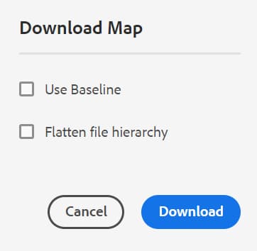 DITA マップファイルをAEM リポジトリに格納したら、マップファイルとその依存ファイルをダウンロードできます。 これにより、オフラインでの編集、検証、レビュー、または単にバックアップを作成するために、完全なマップ ファイルを柔軟に共有できます。