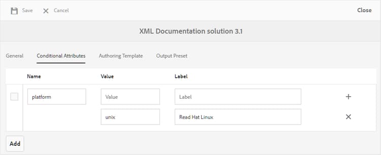 AEM Guidesでは、関連する DITA 属性を使用して、条件属性を簡単に作成し、関連付けることができます。 条件属性は、グローバルレベルまたはフォルダーレベルで定義できます。 グローバルに定義された条件は、すべてのプロジェクトで表示され、フォルダー固有の条件は、指定したフォルダー内で作成されたプロジェクトでのみ表示されます。 コンテンツ作成者は、これらの条件付き属性を使用して、作成または使用する DITA トピックまたはマップのコンテンツに条件を付けることができます。 パブリッシャーはこれらの条件を使用して、条件プリセットを作成できます。 公開者は、条件付きプリセットを使用して、公開された出力に含める条件と除外する条件を決定できます。