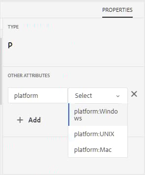 platform 属性はシステムに保存されます。 作成者がフォルダ内の DITA トピックで platform 属性を使用する場合、Web エディタの「プロパティ」タブに値が表示されます。