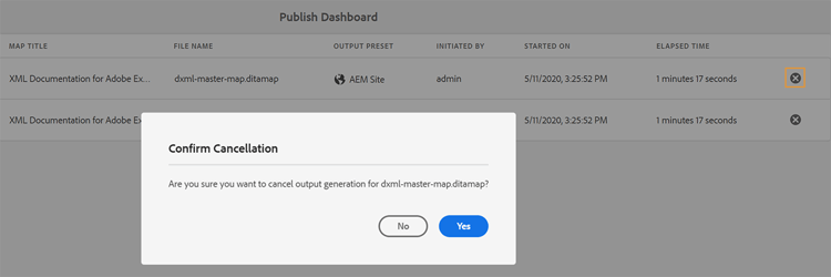 次の手順を実行して、パブリッシュダッシュボードから出力生成タスクをキャンセルします。