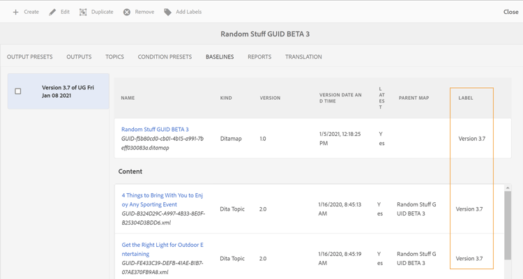 ラベルを使用してベースラインを作成すると、自動的に選択 がすべての参照コンテンツのバージョンに適用されます。