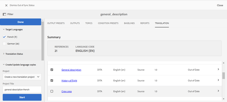 note note NOTE 既に翻訳プロジェクトがある場合、そのプロジェクトにトピックを追加できます。 「プロジェクト」リストから「既存の翻訳プロジェクトに追加」オプションを選択し、「既存の翻訳プロジェクト」リストからプロジェクトを選択します。 -