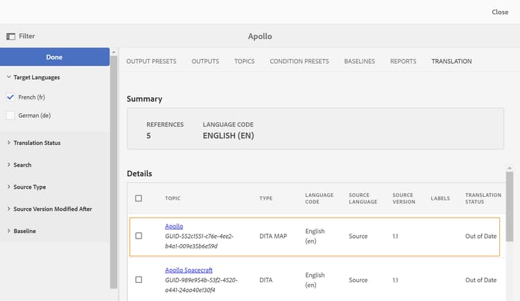 Assets UI のソース言語フォルダにある DITA マップファイルに戻ります。 再翻訳されたトピックが同期されるようになりました。