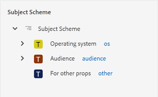 • 件名パネルでタイトル付きのキーを表示:これを選択すると、件名スキームのタイトルと共にキーが表示されます。 このオプションを選択しない場合は、タイトルのみが表示されます。 例えば、ここではキー「os」、「audience」、「other」もタイトルと共に表示されます。