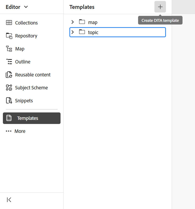 エディタで テンプレート パネルを開き、「DITA テンプレートを作成」アイコンを選択します。