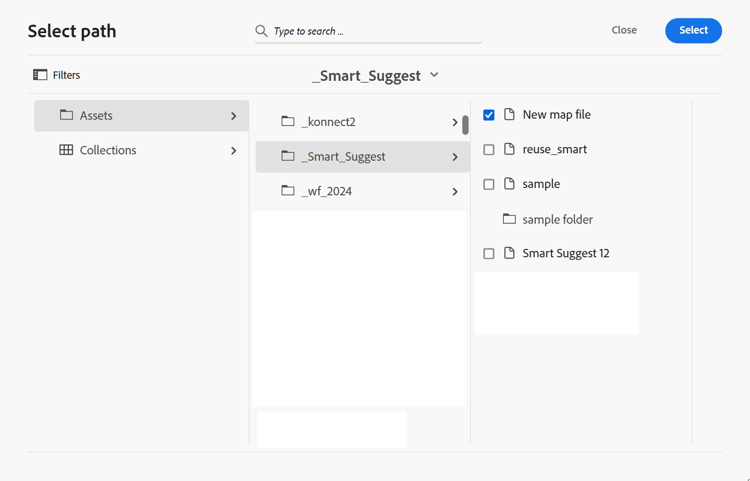 トピック検索ダイアログを表示します。 挿入するトピック/マップ ファイルに移動し、[選択] を選択してマップに追加します。