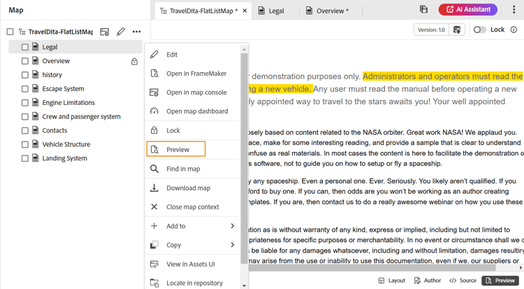 Assets UI: Assets UI で、マップの場所に移動して、マップ ファイルを選択し、ツールバーの マップをプレビュー を選択します。 マップのプレビューが新しいタブに表示されます。 すべてのトピックのコンテンツは、プレビューモードで表示できます。 このビューでは、トピックを編集できません。