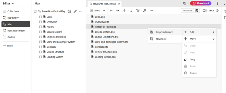 リポジトリパネルで、編集する DITA マップファイルを開きます。