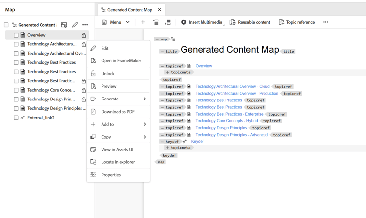 マップを選択し、[Enter] を押すか、ダブルクリックして マップ ビュー で開きます。 詳しくは、左側のパネルにある マップビュー 機能の説明を参照してください。 トピックを選択して Enter キーを押すか、ダブルクリックして コンテンツ編集領域 で開きます。 エディターから直接ファイルを移動して開くことができるので、時間が節約され、生産性が向上します。