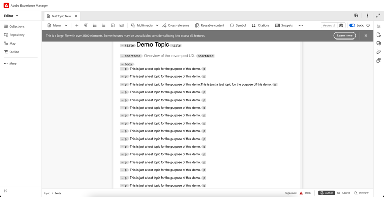 パフォーマンスを向上させるために、取り消し、やり直し、アウトラインパネル、ダーティマーカーなどの特定の機能は無効になっています。 最適なエクスペリエンスを得るには、トピックを小さなトピックに分割することをお勧めします。