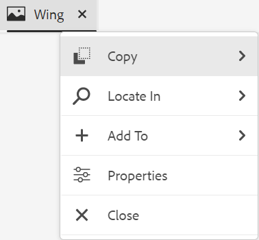 エディターでファイルを開くと、コンテキストメニューから様々なアクションを実行できます。 メディアファイル、単一 DITA ファイル、または複数のファイルのどちらを開くかによって、異なるオプションが表示される場合があります。