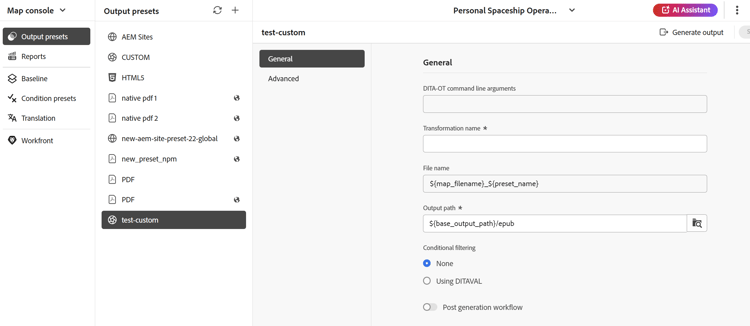 カスタム出力プリセットは、カスタム DITA-OT プラグインで使用できます。 カスタム DITA-OT プラグインを使用して、カスタム DITA-OT 出力プリセットを作成して出力を公開できます。