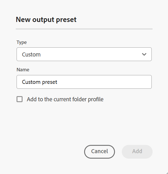 「現在のフォルダープロファイルに追加」オプションを選択して、現在のフォルダープロファイル内に出力プリセットを作成します。