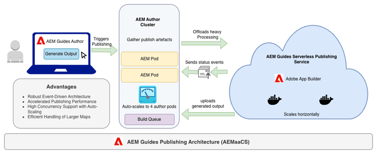 - サーバーレス公開サービスは、Docker コンテナを起動し、アセットをダウンロードして、公開処理を実行し、生成された出力アーティファクトをExperience Manager Guidesに戻します。