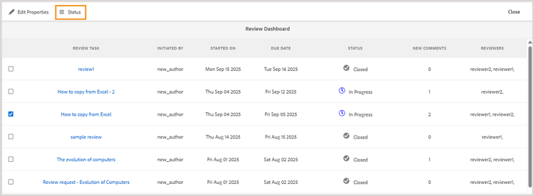 Experience Manager Guidesでは、各レビュータスクには、現在のステータスを反映したステータスがあります。 レビューダッシュボードからこの情報にアクセスするには、タスクを選択し、「ステータス」オプションを選択します。